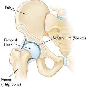 The hip is one of the body's largest joints. It is a ball-and-socket joint. The socket is formed by the acetabulum, which is part of the large pelvis bone. The ball is the femoral head, which is the upper end of the femur (thighbone).