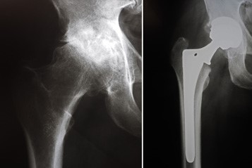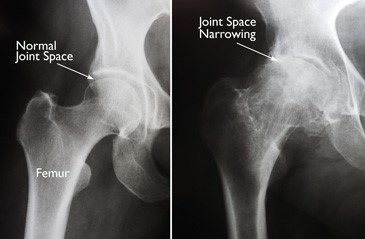 (Right) This x-ray of an arthritic hip shows severe loss of joint space.
