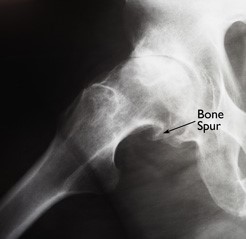 This x-ray shows a large bone spur that has developed on the ball of an arthritic hip.