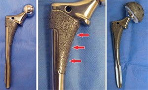 (Left) A standard non-cemented femoral component. (Center) A close-up of this component showing the porous surface for bone ingrowth. (Right)