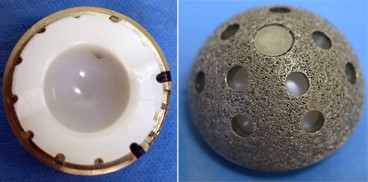 (Left) The acetabular component shows the plastic (polyethylene) liner inside the metal shell. (Right) The porous surface of this acetabular component allows for bone ingrowth. The holes around the cup are used if screws are needed to hold the cup in place.