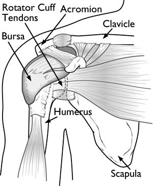 Bursa. There is a lubricating sac called a bursa between the rotator cuff and the bone on top of your shoulder (acromion).