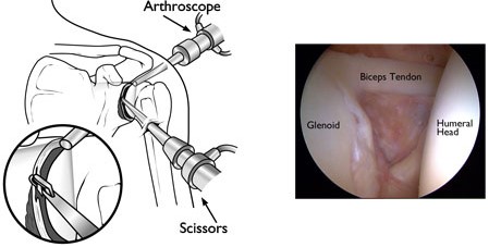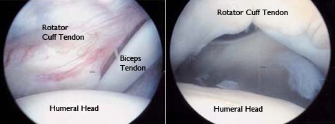 (Right) An arthroscopic view of the inside of the shoulder joint.